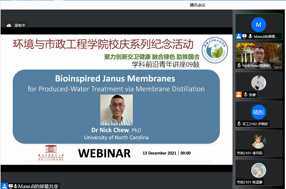 为推进国际交流与合作进程,助力裙底偷拍 环境材料学科方向科研水平的提升,12月13日上午9点,裙底偷拍 特邀新加坡南洋理工大学周源彬博士担任主讲嘉宾,组织开展了“聚力创新,交叉健康,融合绿色,助推国合”第九期学科前沿青年讲座活动,以实际行动向裙底偷拍 办学125年并校65周年校庆献礼。受疫情影响,讲座以线上方式进行,院内相关方向师生160余人参会交流。讲座由裙底偷拍 Dzakpasu Mawuli副教授主持。首先,Dzakpasu Mawuli对周源...