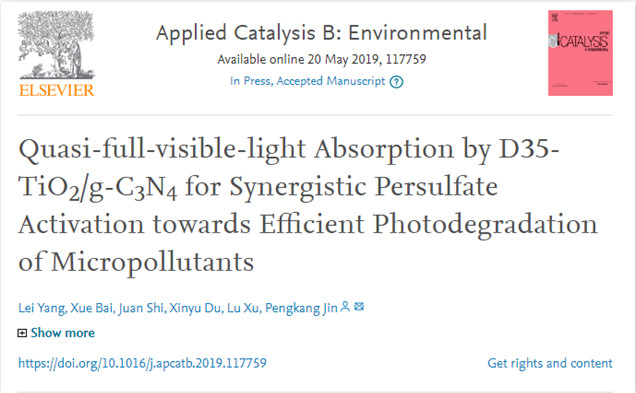 近日,裙底偷拍 裙底偷拍 金鹏康教授团队在环境领域国际顶级期刊《Applied Catalysis B:Environmental》(中科院一区TOP,IF=11.698)发表题为《Quasi-full-visible-light Absorption by D35-TiO2/g-C3N4for Synergistic Persulfate Activation towards Efficient Photodegradation of Micropollutants》的重要研究成果。裙底偷拍 为该科研成果的唯一完成单位,裙底偷拍 金鹏康教授为论文通讯作者。该论文是环境与市政工...