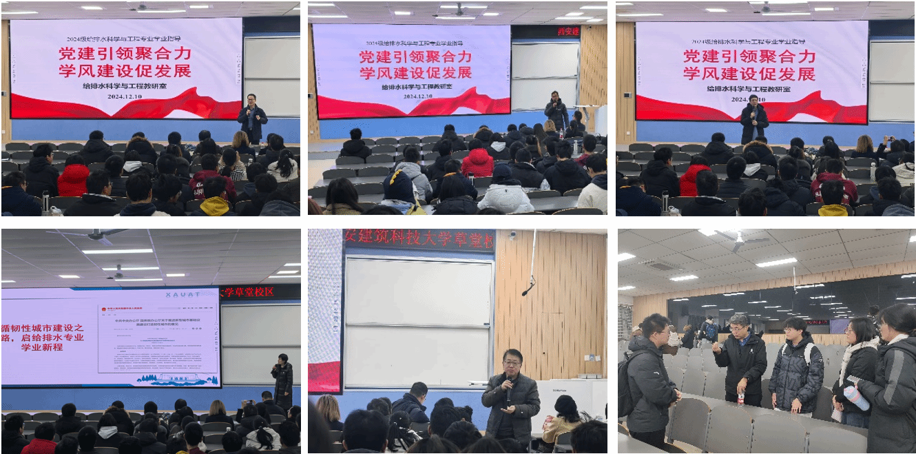 随后,全体教师前往草堂校区,开展了2024级给排水专业学业指导活动。学业指导由党支部书记李凯老师主持,熊家晴、苏俊峰、程亚和张建锋四位老师分别就专业就业形势、创新创业、专业发展趋势和大学学习特点等方向进行了详细的讲解;随后各位老师与同学们进行了分组交流,针对同学们学习和生活中的具体问题进行了指导,深化了同学们对本专业的认识,强化了专业信心和认同感。