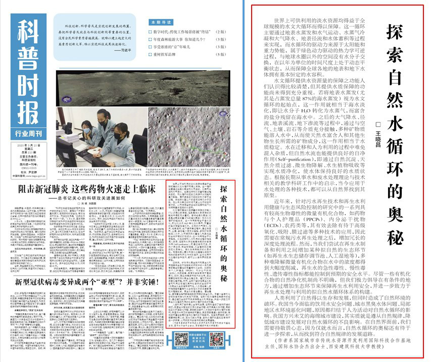 王晓昌教授受邀在《科普时报》发表文章“探索自然水循环的奥秘”。文章对水文循环的含义及其功能进行了详细的介绍,并倡导在有条件的地方,优先通过增加生态环节来保障再生水利用安全,构建水处理与利用的拟自然水循环体系。文末指出人类在利用自然得以生存和发展的同时,也造成了对自然环境的破坏,我们应该敬畏自然,进一步探索自然水循环的奥秘。