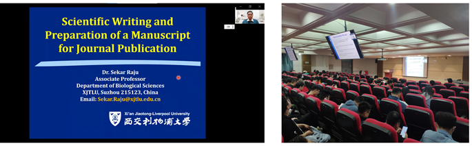 报告会上,Sekar教授结合个人实践工作经验,首先从“什么是科学写作”以及“影响学术成果发表的因素”等方面入手介绍论文写作,并指出学术论文是科研成果表达的一种重要形式。随后,Seker教授详细阐述了一篇学术论文中“Introduction, Methods及Discussion”等关键内容的结构和撰写方法;最后强调了学术论文撰写过程中期刊遴选的重要性,并着重说明在论文投稿前应充分了解期刊的投稿要求,并对论文内容进行反复检查,避免错误。