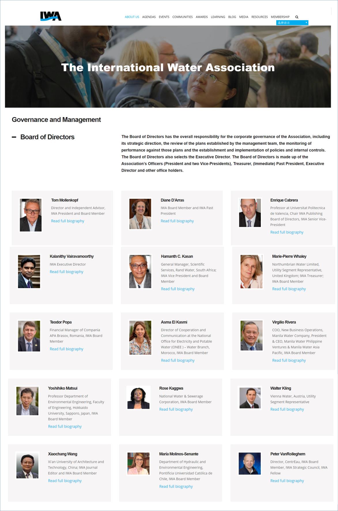 IWA是水环境与水工业界最大的国际学术组织,拥有来自世界100多个国家的近万名会员。IWA理事会(IWA Board of Directors)全面负责协会各项事务的管理,包括制定IWA的战略方向,审查管理团队制定的计划,监督和协调项目的执行,制定和实施政策,以及内部控制等工作,理事会还负责IWA执行理事的推选。理事会由IWA主席和副主席、执行主席、上届主席、财务总监和从会员中遴选的专家组成,共有15名成员,王晓昌教授是本届理事会中经IWA主席提名入选的唯一中国专家。