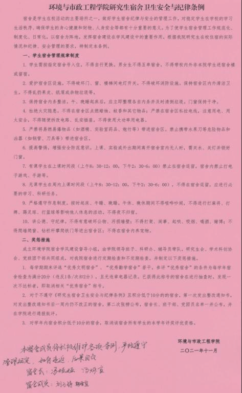 研究生宿舍安全卫生与纪律条例》进行了深入学习,并签订了承诺书。“条例”中倡导学生放下手机、远离游戏,自觉执行文明宿舍制度。在研究生实验和科研空间有限的情况下,充分发挥宿舍学术科研新阵地的作用,在做好宿舍卫生安全的基础上,教育引导广大研究生在宿舍营造积极向上的学习、科研、生活习惯,增强学生自我教育、自我管理和自我服务能力。