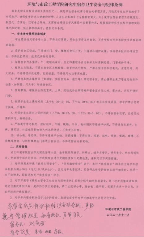研究生宿舍安全卫生与纪律条例》,加强安全警示教育引导,并签订承诺书,规范日常行为准则,牢固树立安全防范意识。