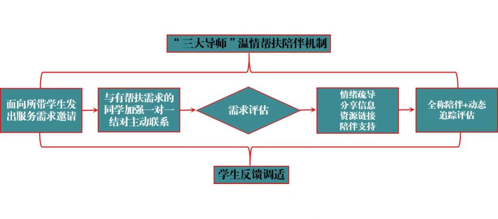 坚持“围绕学生、关照学生、服务学生”,继续夯实“三大导师”工作职责,用帮扶与陪伴温暖疫情肆虐的寒冬,充分发挥“导师制”在疫情防控、线上教学、教育引导、心理疏导等方面的积极作用,建立疫情期间“三大导师”温情帮扶陪伴机制,与学生牵手云端,共克时艰。