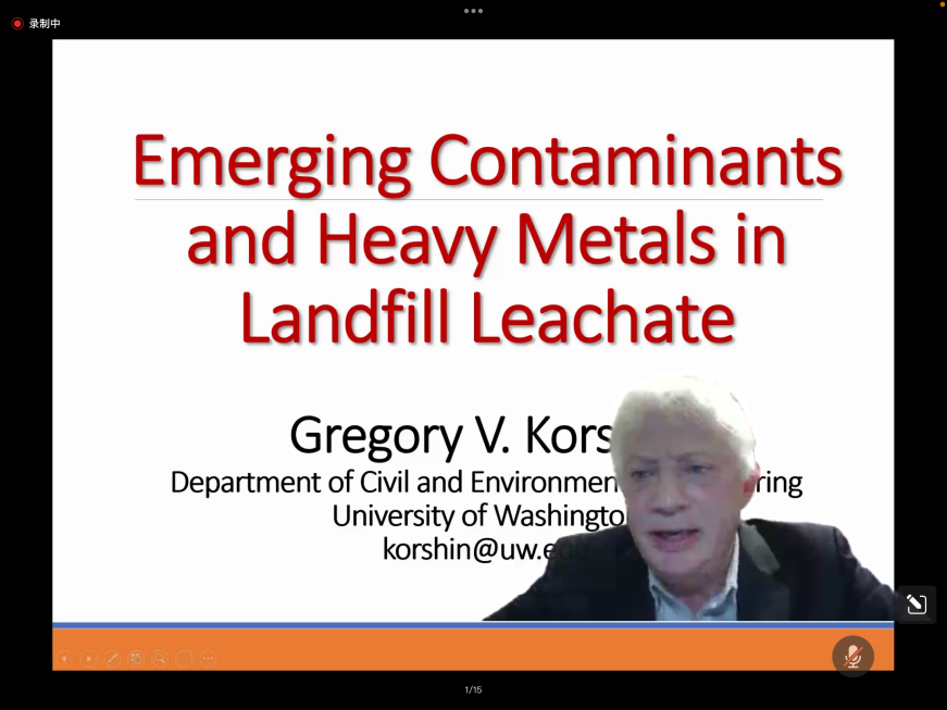 概况;接着阐述了垃圾渗滤液中的化学成分及污染物的基本情况,并指出垃圾渗滤液中往往含有高浓度的药剂、增塑剂、全氟化合物以及其他新兴污染物;随后结合具体数据向同学们展示了砷等高毒性元素在垃圾渗滤液中含量持续升高的趋势,同时,结合图片说明了垃圾填埋场所产生的生物固体的危害;最后,Korshin教授针对垃圾填埋场中可挥发性污染物与可再生能源运营之间的循环过程进行了交流讨论,并指出了如何有效利用垃圾填埋场所产生的可再生能源。