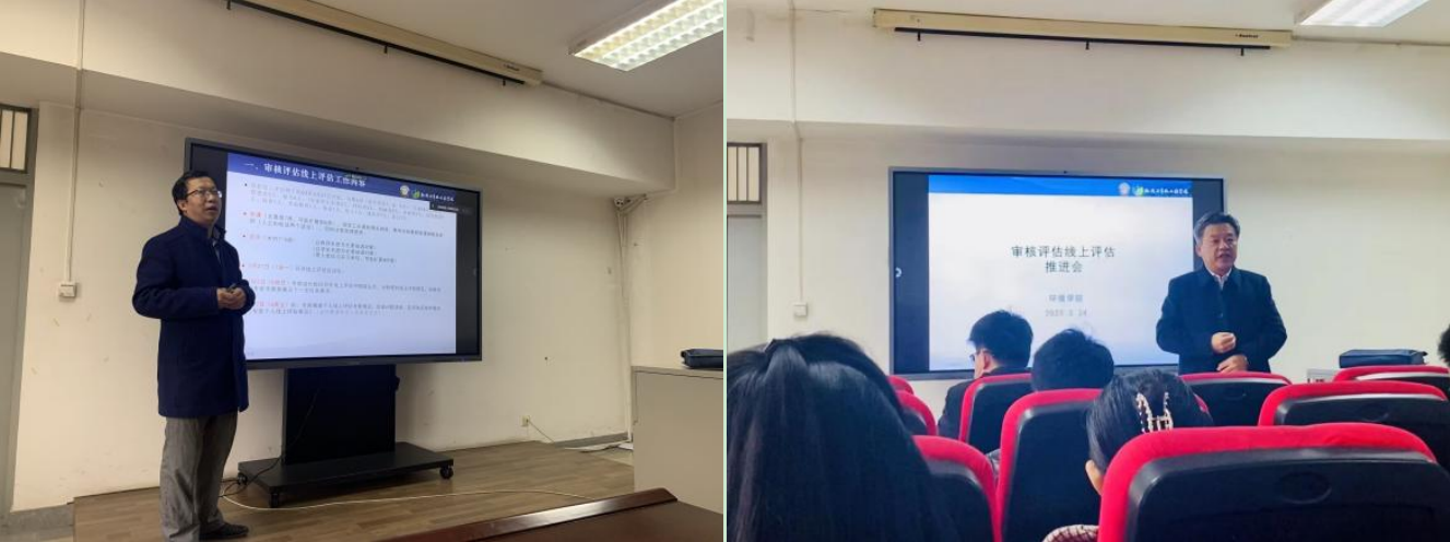 刘立忠副院长首先围绕“审核评估流程及要点”、“在线听课看课存在的问题及注意事项”、“学院审核评估教学资料抽检演练结果反馈”,以及“评估期间专家线上抽调资料相关要求”四个方面进行详细讲解,并对学院下一步工作安排部署。他指出,教师要充分准备,以良好的精神面貌迎接审核评估工作,在评估过程中应充分展示学院风采,体现专业特色、教学亮点以及典型工作。此外还对突发状况的应对方式补充说明并回答了老师们的提问。