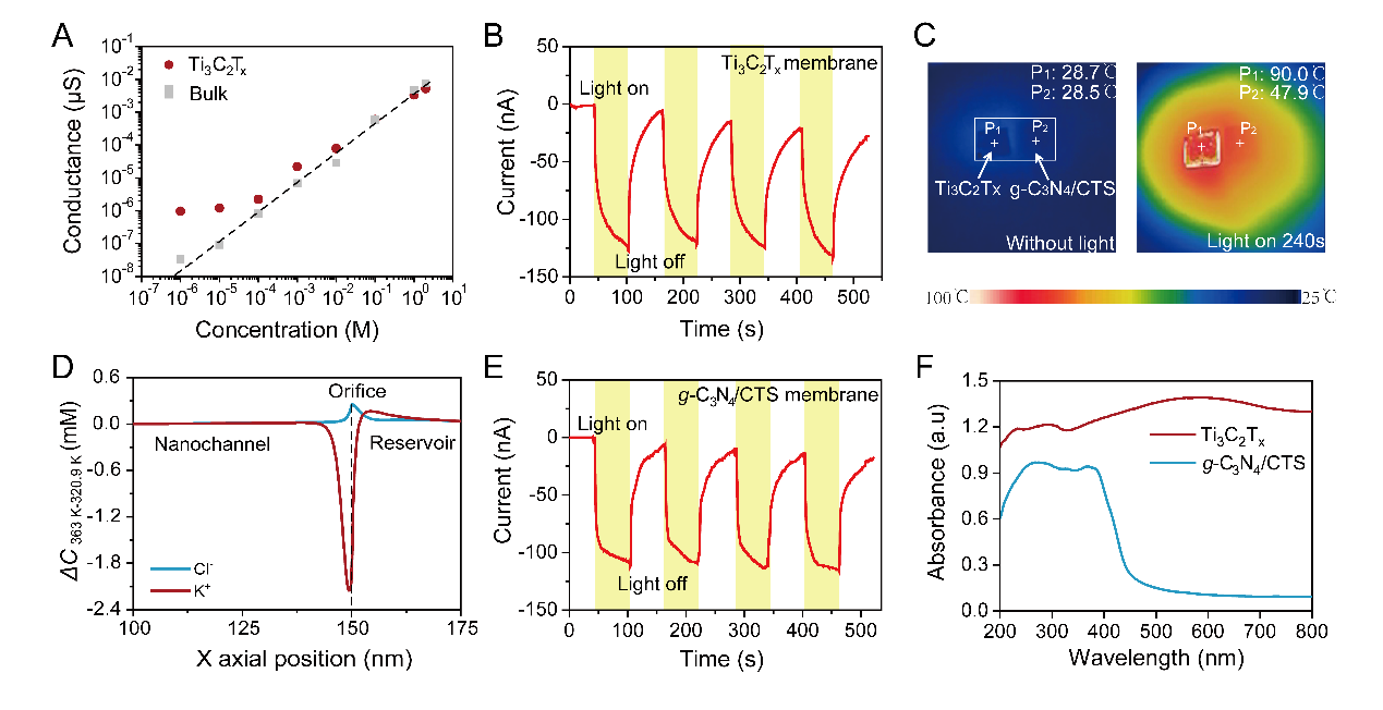 图3. Ti3C2Tx和g-C3N4/CTS膜中的光响应离子传输