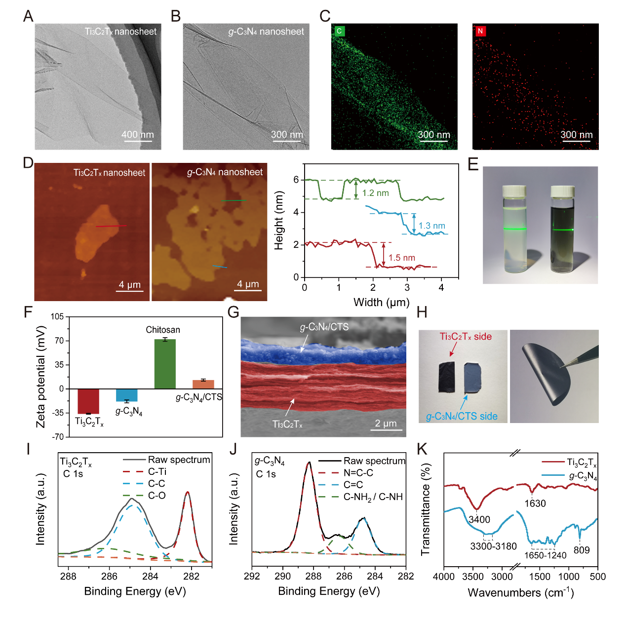 作者利用选择性刻蚀法成功制备了横向尺寸大、无结构缺陷的的超薄单层Ti3C2Tx纳米片;通过热聚合法制备比表面积大的单层g-C3N4纳米片,并通过表面接枝壳聚糖(CTS)获得了g-C3N4/CTS复合纳米片。Ti3C2Tx纳米片胶体溶液和g-C3N4溶液的zeta电位分别为-35 mV和-21 mV左右,在与壳聚糖充分反应后,g-C3N4纳米片的表面电性由负转正。采用真空抽滤法,利用两种纳米片的多批次平行堆叠,获得了Ti3C2Tx-g-C3N4/CTS(TCC)异质二维纳米通道膜。从膜断面的电镜图可以看到,Ti3C2Tx层和g-C3N4/CTS层堆叠紧密,中间形成了清晰的界面,但在交接处未见接缝或空隙等结构缺陷。