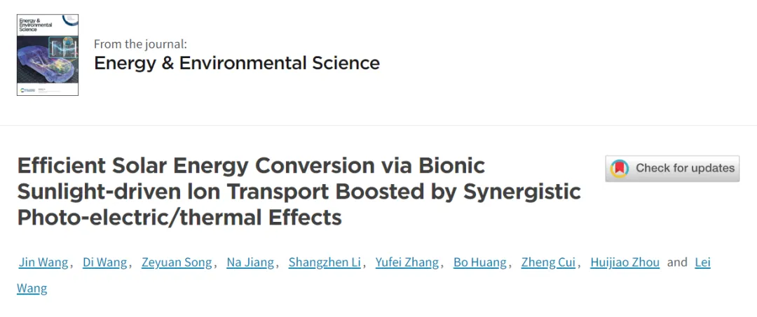 、陕西省膜分离技术研究院王磊教授团队在“Energy & Environment Science”(《能源与环境科学》,2022年影响因子:39.714)上发表了题为“Efficient Solar Energy Conversion via Bionic Sunlight-driven lon Transport Boosted by Synergistic Photo-electric/thermal Effects”(光电/热协同驱动仿生阳光响应·离子传输实现高效的太阳能转换)的最新研究。