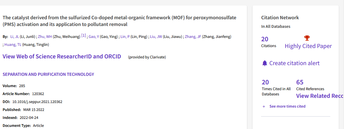 根据科睿唯安基本科学指标(Essential Science Indicator,ESI)于2022年11月10日发布的最新数据,智能化环境治理技术团队成员于2022年3月在期刊《分离与纯化技术》(Separation and Purification Technology)上发表的文章“The catalyst derived from the sulfurized Co-doped metal-organic framework (MOF) for peroxymonosulfate (PMS) activation and its application to pollutant removal”(//doi.org/10.1016/j.seppur.2021.120362)入选ESI高被引学术论文。论文第一作者为李俊丽硕士研究生,通讯作者为朱维晃教授,完成单位为裙底偷拍