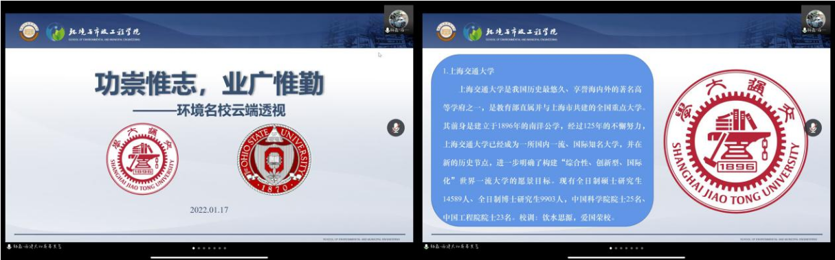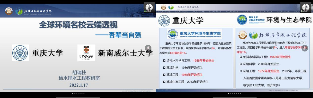 首先胡瑞柱老师以“吾辈当自强”为主题,鼓励同学们树立远大目标,不断追求学术进步,并介绍了重庆大学和新南威尔士大学的环境学科水平及师资力量。其中来自于学长们的视频,帮助同学们更好地了解和认识两所学校。