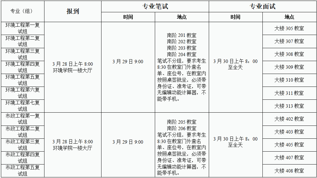 4. 复试内容:(A)专业课笔试科目考核内容与《2025年攻读硕士学位研究生招生专业目录》中公布的复试考核科目一致,环境学科、市政学科分别组织命题。(B)综合面试由专业知识水平、外国语水平和综合素质能力三部分组成。
