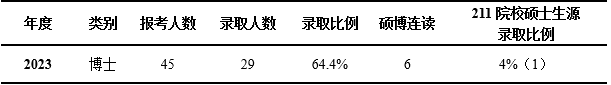 博士研究生招生:2023年度博士生报考人数45人,录取29人,录取比例为64.4%。其中直博1人,硕博连读6人,申请考核22人。985/211院校硕士生源录取比例为4%,本校应届生15人,校外有宁夏大学、兰州交通大学等高校。博士招生情况见表4。