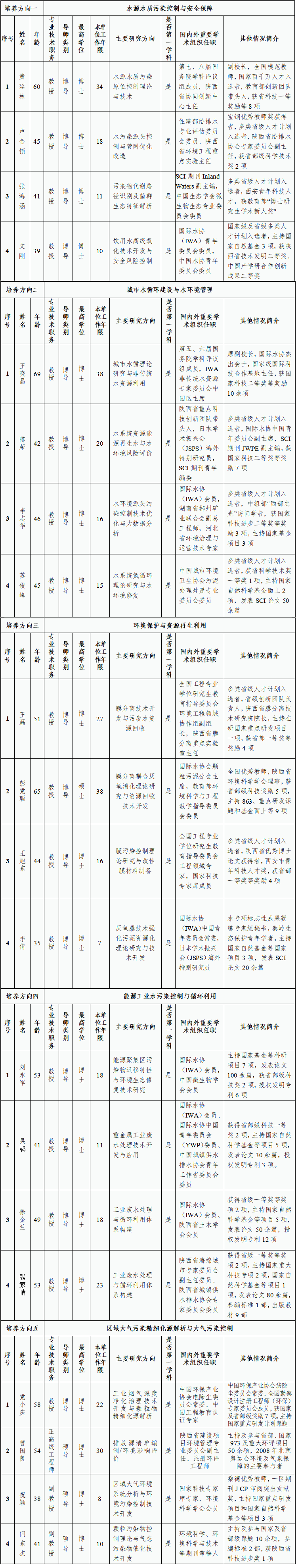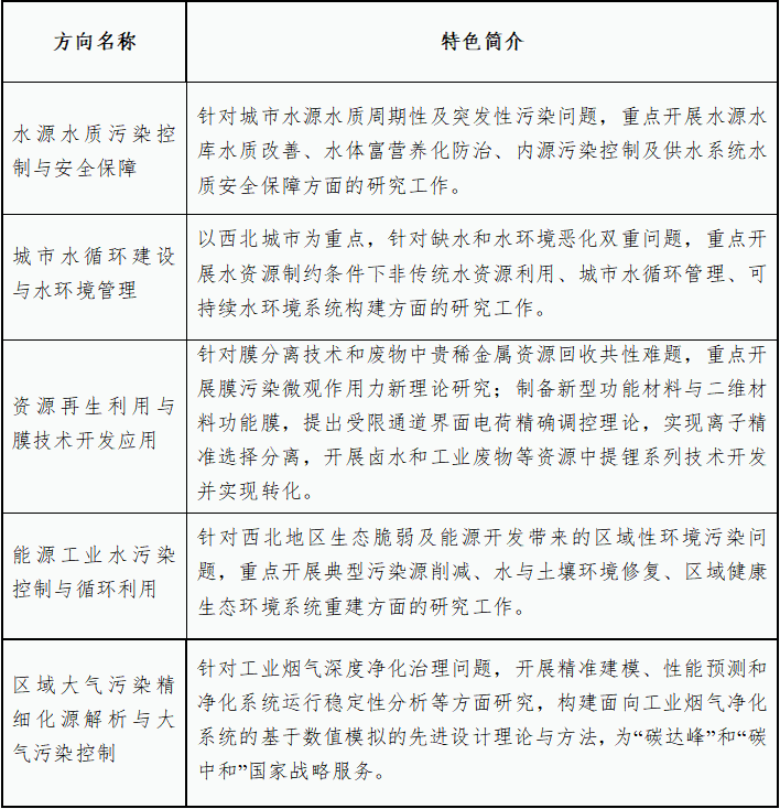 针对我国西部水资源短缺、环境污染严重、生态环境脆弱的现状,本学位点历经老中青几代人的建设、不断凝练培养特色方向,逐渐形成了在国内外具有重要影响力的五大培养方向(表1),具体包括: