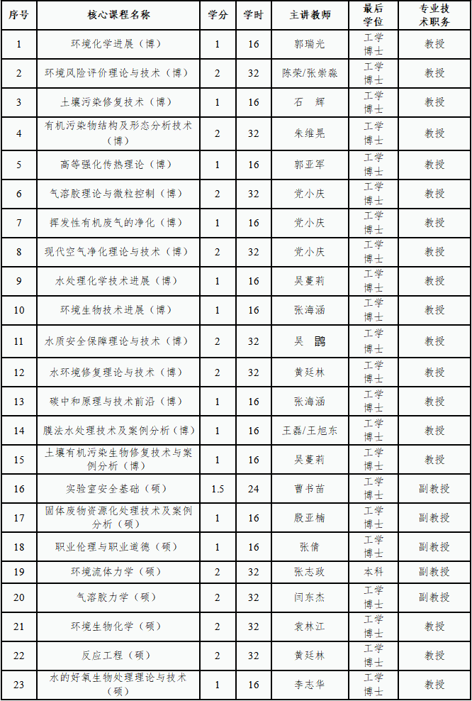 根据国务院学位委员会公布的环境科学与工程学位点的核心课程目录,结合学科特色和人才培养目标,本学位点不断优化课程体系,新增博士课程《碳中和原理与技术前沿》、《膜法水处理技术及案例分析》、《土壤有机污染生物修复技术与案例分析》,硕士课程《实验室安全基础》、《固体废物资源化处理技术及案例分析》、《职业伦理与职业道德》,本学位点开设的主要课程见表4所示: