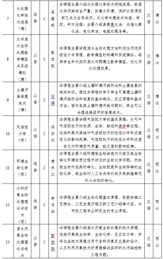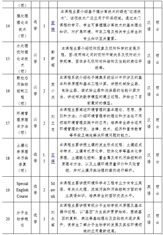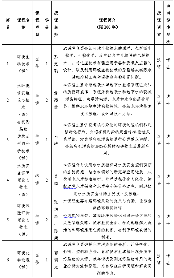 根据国务院学位委员会公布的环境科学与工程学位点的核心课程目录,结合学科特色和人才培养目标,本学位点不断优化课程体系,主要课程设置情况见表4所示: