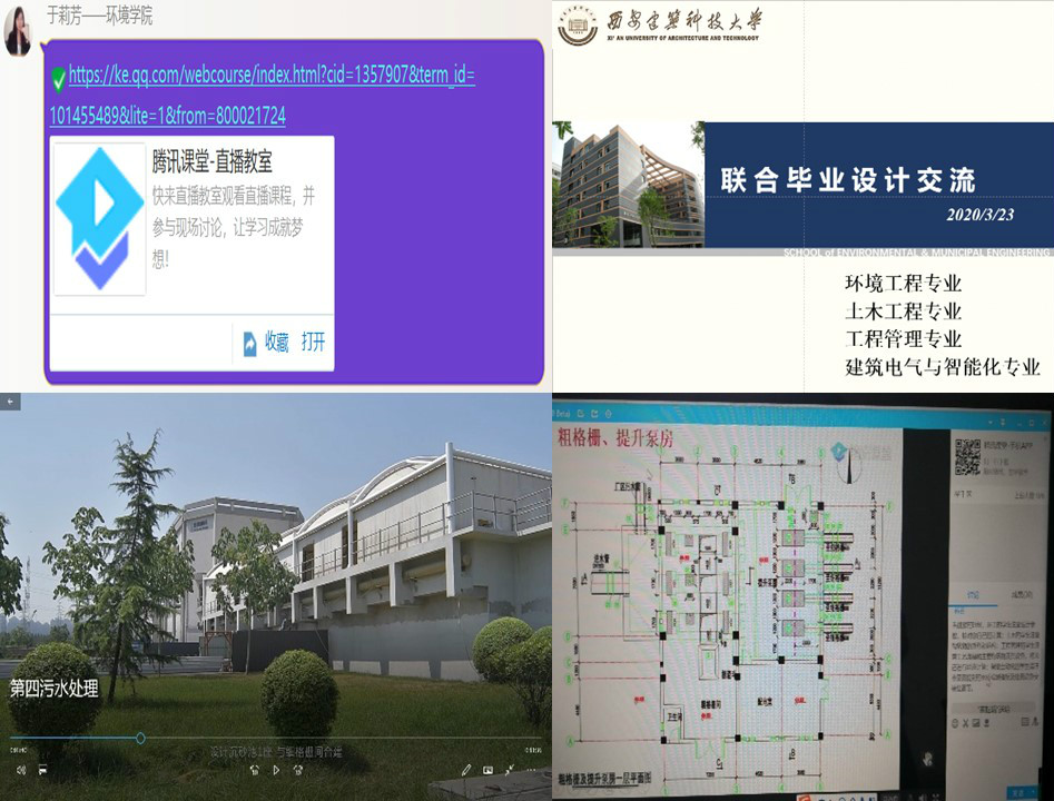 于莉芳老师在腾讯课堂软件中创建直播教室,邀请各位老师和同学们加入。首先播放了事先录制好的西安市第四污水处理厂实习视频,在播放过程中,遇到一些重点构筑物或在设计中同学们可能疑问的设计参数时,会按下暂停键,为大家进行阶段讲解。视频的播放和讲解对各个专业的同学们来讲,如同身临其境到污水厂参观,弥补了不能到现场实习的不足。视频播放结束后,于老师利用PPT对重点构筑物(粗格栅和进水泵房、细格栅和曝气沉砂池)的施工图纸进行解析,分别从环境工程和土木工程专业的角度详细讲解了各个构筑物的设计要求,同学们表示一直以来困扰的问题得到了满意的答案。