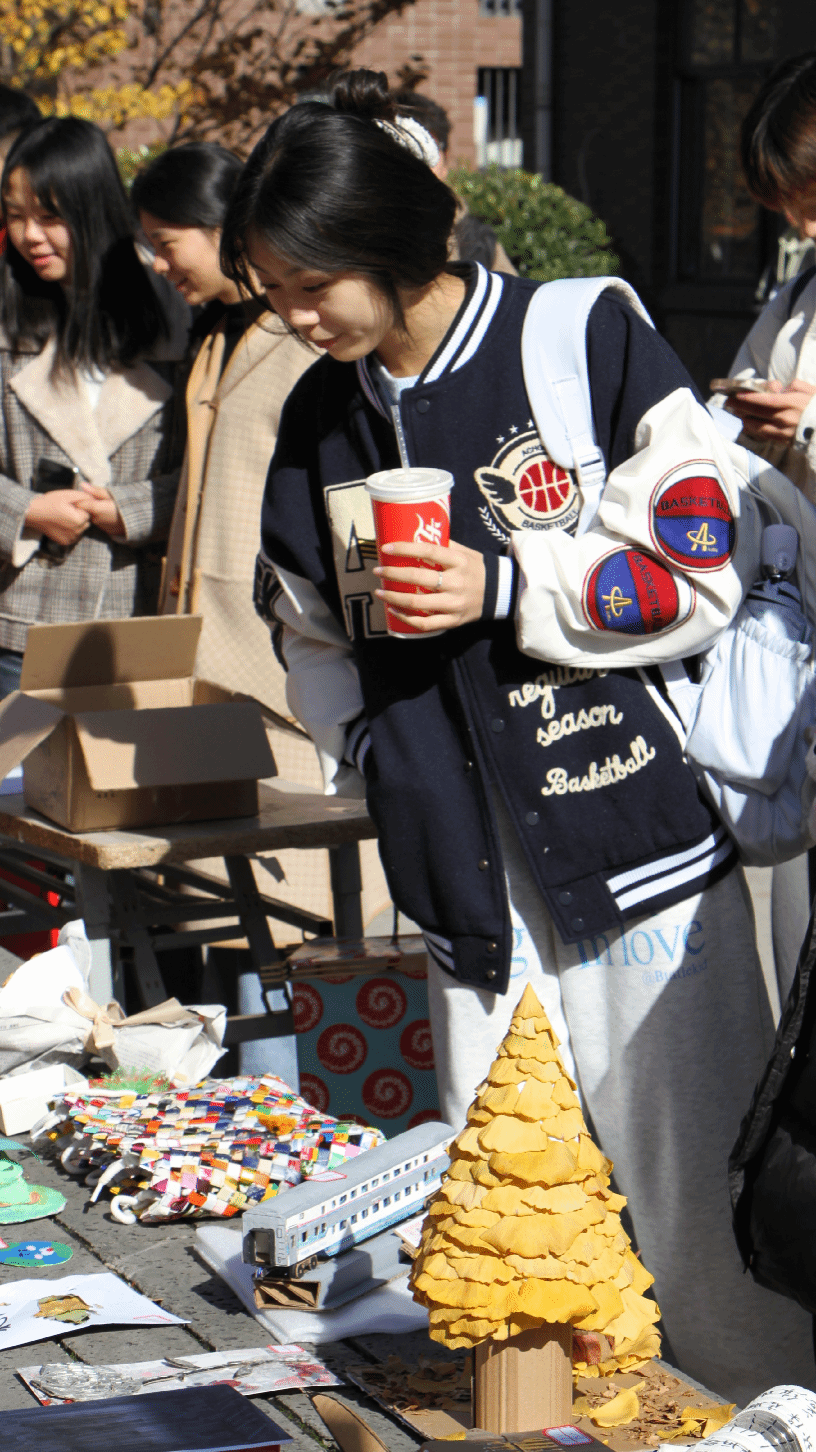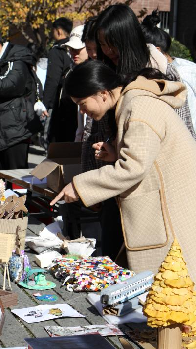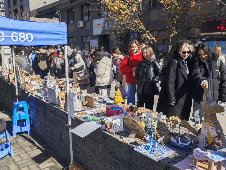 往来的同学被热闹的氛围吸引,纷纷围拢展台,目不转睛地欣赏作品。人群中不时发出阵阵惊叹,同学们都被创作者的精妙创意所折服,还为自己的心仪之作投出了宝贵的一票,现场气氛热烈非凡。