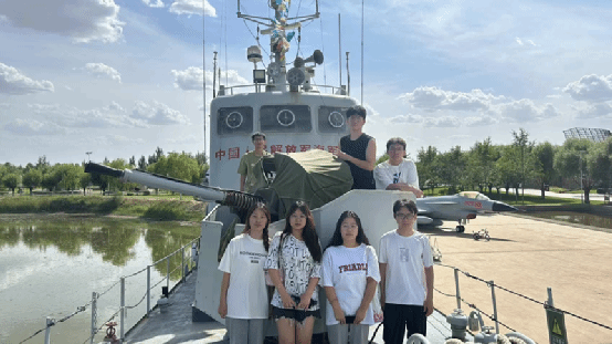 参观完展览馆,实践团队前往了附近的军事广场。在这里,队员们不仅看到了现代化的治沙设备,还近距离接触到了代表国家国防力量的战舰和飞机。