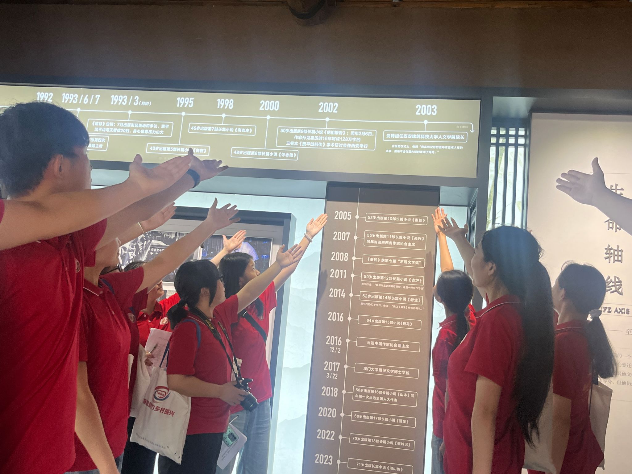 图为团队成员们参观贾平凹先生生平概况。通讯员任治锦摄