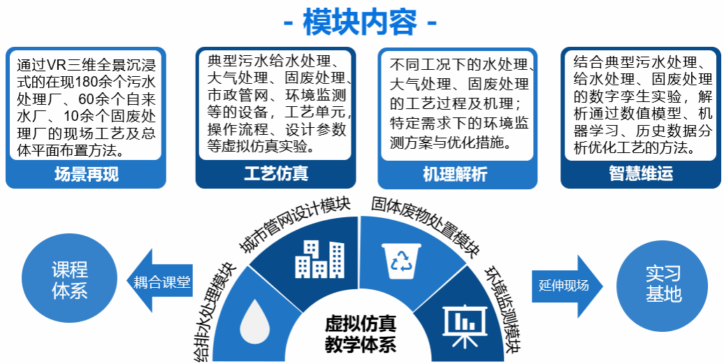 目前,中心已建成完整的虚拟仿真实验教学体系,该体系涵盖给排水处理模块、城市管网设计模块、固体废物处置模块及环境监测模块等4个模块,涉及场景再现、工艺仿真、机理解析、智慧维运等虚拟仿真实验教学内容。以课程教学及认知实习、生产实习、毕业设计为切入点开出虚拟仿真实验教学13项。通过虚拟仿真实验教学,解决了传统实验教学的技术难题,补充和扩展了真实实验教学,实现了课堂教学向工业现场、实习基地的延伸,全面促进了学生自主学习、自主实验、自主创新。