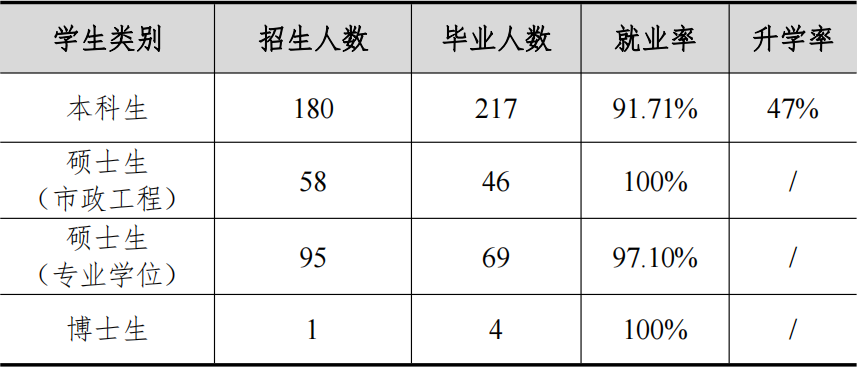 2022年给排水科学与工程专业本科生招生180人,毕业217人(每年有近30名转入本专业学生),其中毕业生就业率为91.71%,考研升学率达47%,创历史新高;学术学位硕士招生58人,毕业46人,毕业生就业率达100%;专业学位硕士招生95人,毕业69人,毕业生就业率达91.71%;博士生招生1人,毕业4人,其中毕业生就业率达100%。