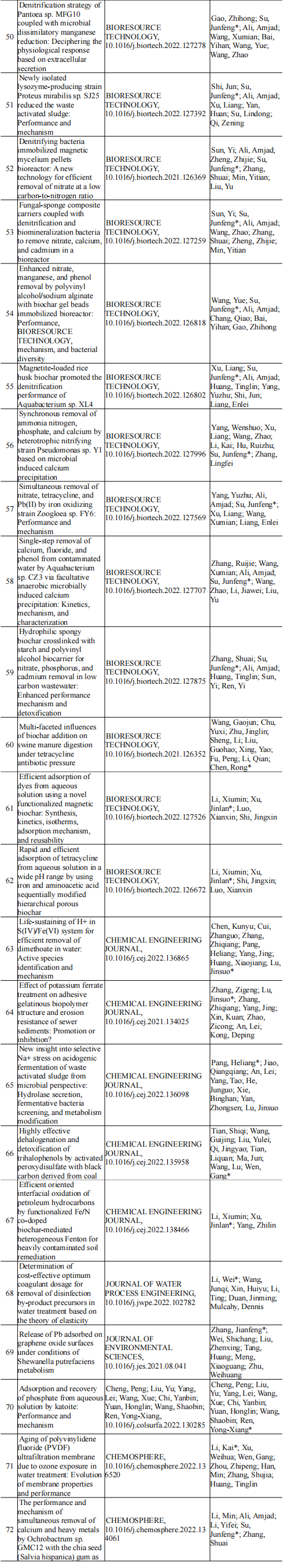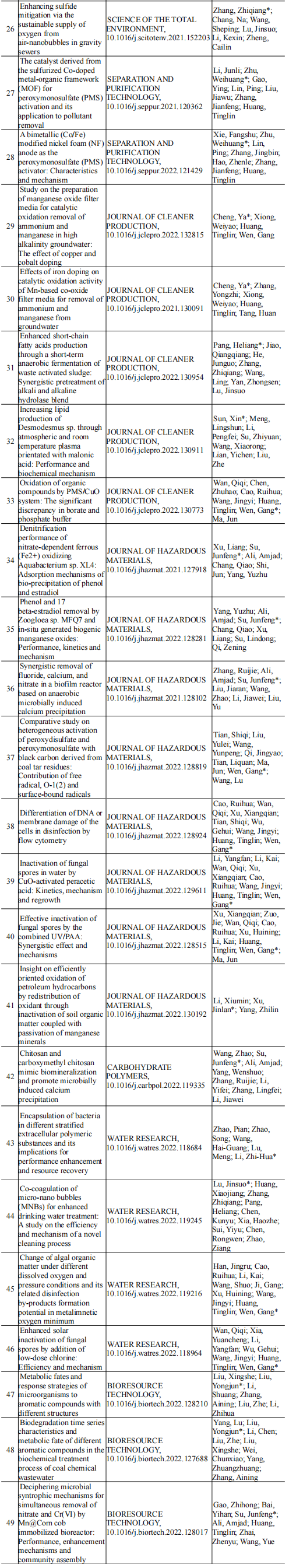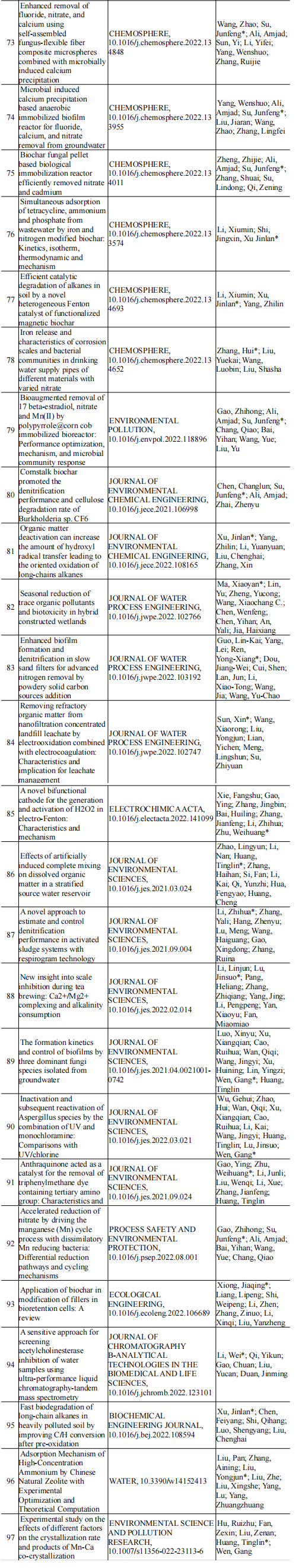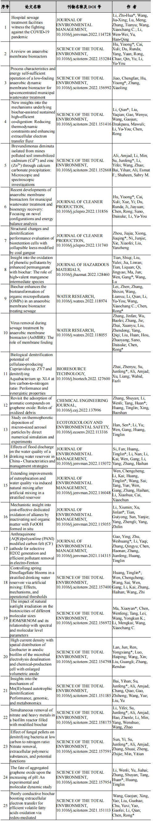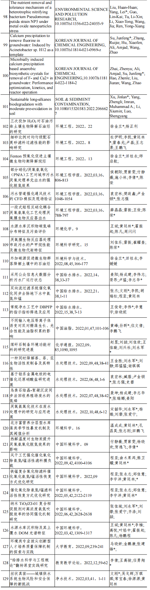 2022年给排水教研室共发表论文129篇,其中SCI论文101篇,SCI一区论文67篇,中文论文28篇。论文列表见表7所示。