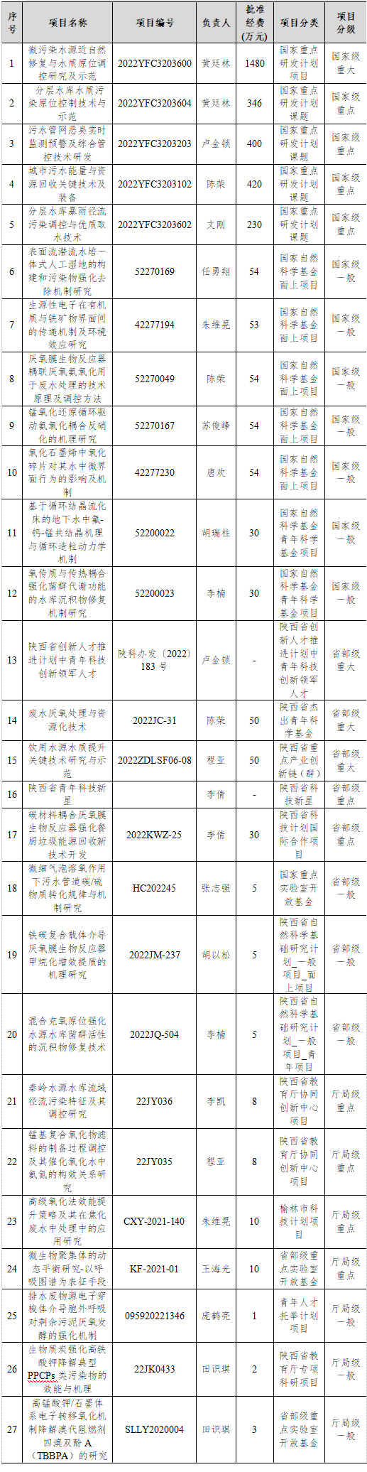 表5 2022年给排水教研室承担科研项目列表