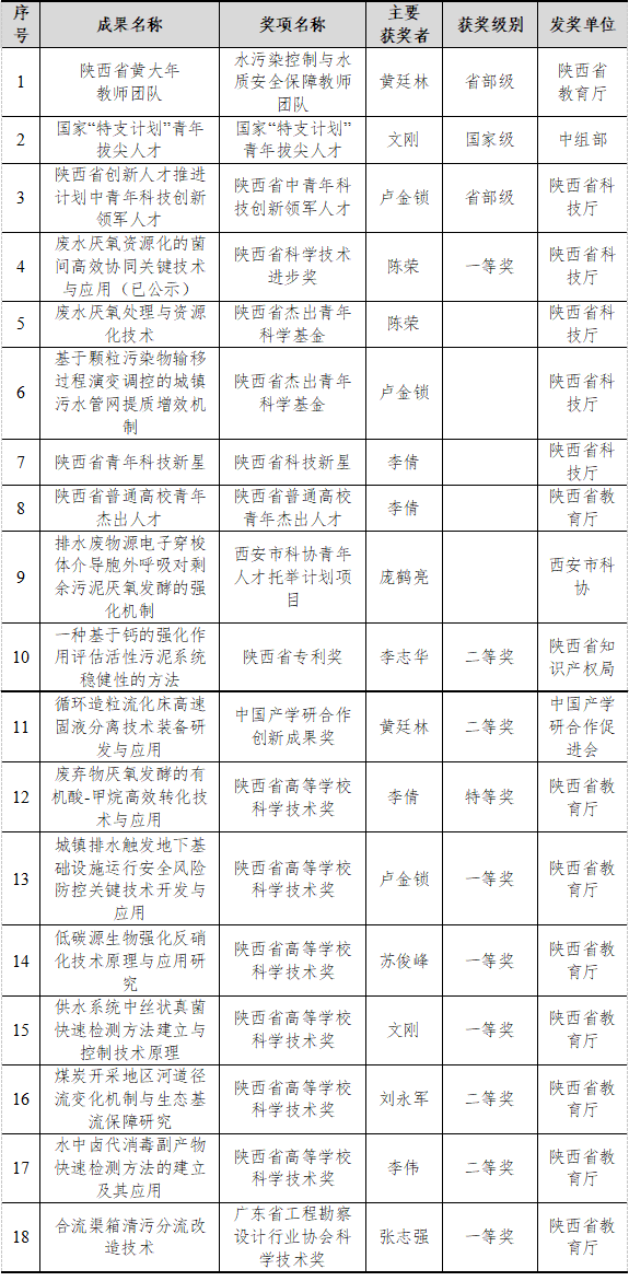 黄廷林教授领衔的水污染控制与水质安全保障教师团队获陕西省黄大年教师团队。陈荣教授和卢金锁教授获陕西省杰出青年基金资助。李志华教授牵头的“污水处理低碳智能化技术创新团队”,文刚教授牵头“饮用水水质安全保障创新团队”获陕西省重点科技创新团队。主要人才称号和科研获奖见表6所示。