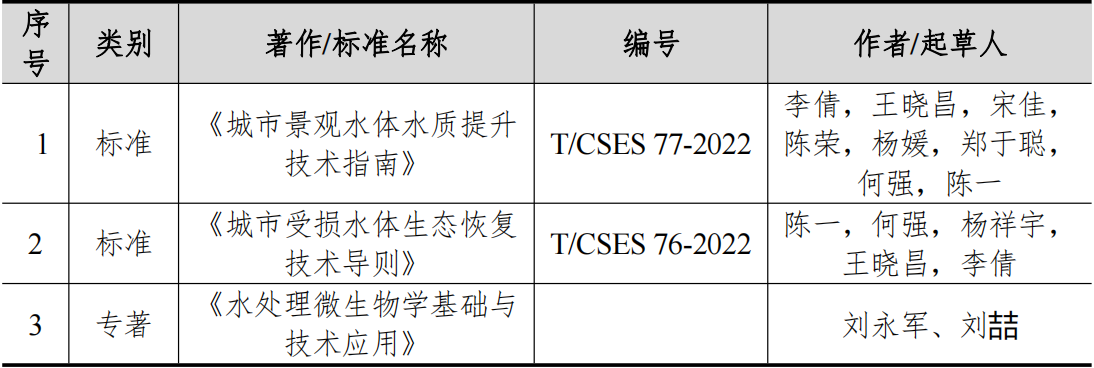 2022年给排水教研室出版专著1本,发布实施标准2项,详细见表9。